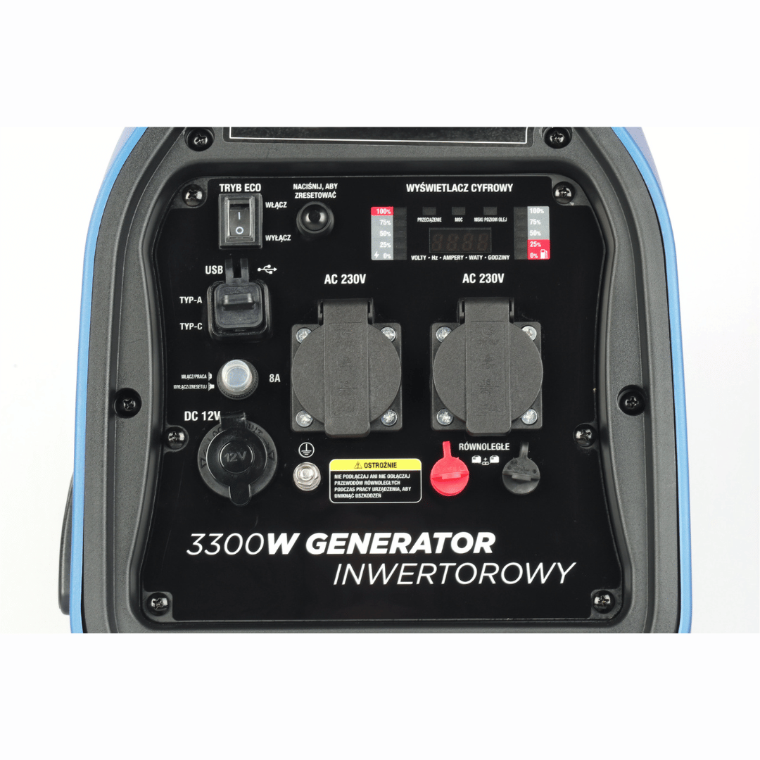 - Wyświetlacz cyfrowy na którym są: poziom paliwa, procent mocy oraz pomiary: AMP, HZ, V, W, godziny a także kontrolki niskiego poziomu oleju, przeciążenia i mocy